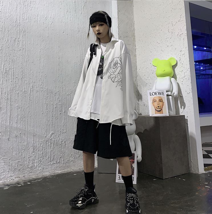 「ALL-CHAMP」トップス シャツ レディース メンズ ユニセックス 白 ホワイト 黒 ブラック 長袖 ワンポイント スタイリッシュ オルチャン 韓国ファッション 18