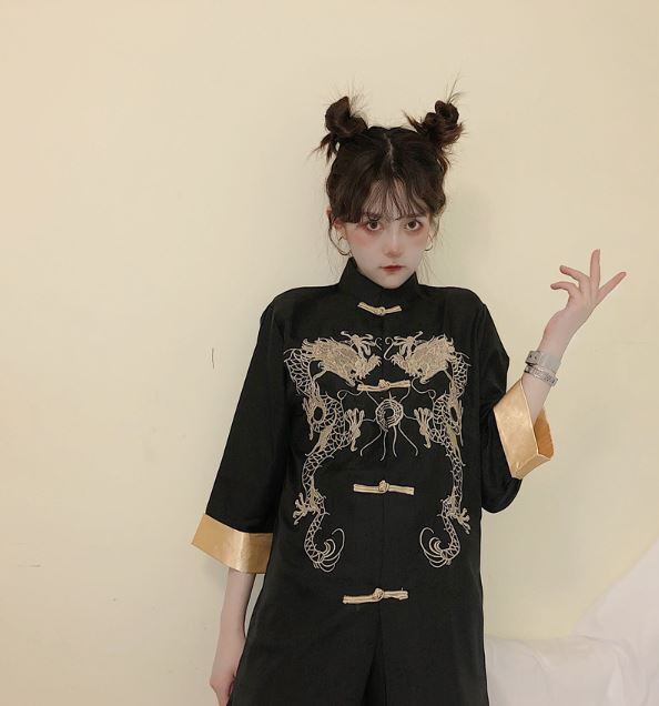 「ALL-CHAMP」レディース トップス シャツ ブラウス チャイナ風 香港風 可愛い 黒 ブラック ピープス カジュアル ストリート オルチャン 韓国ファッション 26